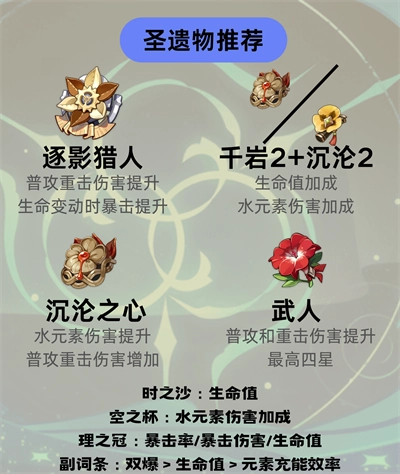 ①圣遗物选择上,那维莱特的核心需求是水元素伤害加成与普攻、重击伤害加成,因此逐影猎人或沉沦之心都是适配套装——逐影猎人自带暴击率加成,适合面板暴击率偏低的情况;若暴击率已达较高水准,则优先考虑沉沦之心。在凑齐上述两套四件套且主词条符合要求前,可采用生命值提升二件套搭配水元素伤害加成二件套过渡;前期阶段,武人四件套能大幅强化普攻与重击伤害,可作为过渡选择。