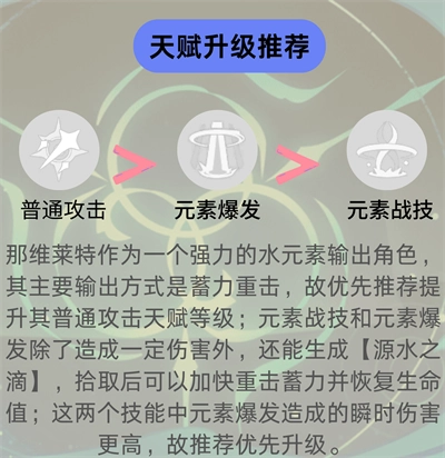 ③天赋培养上,那维莱特的核心输出依赖蓄力重击,因此建议将该天赋至少拉到9级,资源充裕的话可以投入智识之冕(其重击伤害不仅受抗性、生命值、双爆这类通用属性影响,还会被固有天赋一的水元素反应机制加成——触发的水元素相关反应种类越多,蓄力重击的伤害提升就越明显;而固有天赋二能在生命值高于80%时,额外提供30%的水元素伤害加成,所以实战中建议尽量维持高生命值状态);元素战技与元素爆发则推荐升级到8至9级就足够。