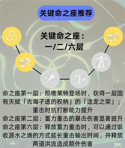 ④命座方面,那维莱特零命就具备出色的输出能力,每个命之座都能稳步强化其输出表现。普通玩家可考虑解锁一命,第一层命座能让那维莱特的固有天赋一固定生效一层,更便于叠满该天赋效果;第二层命座大幅提升重击爆伤,进一步增强重击伤害;第六层命座则显著延长那维莱特蓄力重击的输出时长,使其解锁完全体状态,只要有一定练度,应对游戏中绝大多数敌人都能轻松取胜。