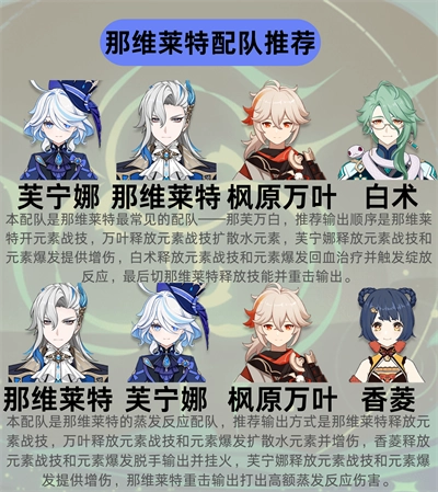 ⑤配队方面,那维莱特的配队选择较为广泛,除了常见的那芙万白之外,还可以使用双水配队、蒸发配队等方式;除了图中展示的配队之外,双水配队一般是搭配上达达利亚等水元素输出角色形成双c输出阵容,配上枫原万叶和钟离辅助,也能打出不俗的伤害。