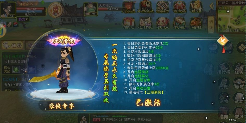 其次是侠名,这可以说是必备的,它的重要性也非常大。有了侠名,我们就能开启远程商店、远程强化、远程仓库功能,还能使用自动出售——这个功能在我们挂机刷等级时帮助很大。最关键的是,侠名是永久有效的。