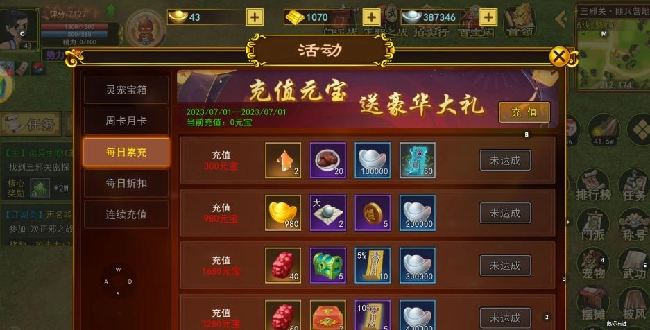 其次是每日充值福利,根据每日充值额度的不同,能获取对应等级的装备与道具。对于普通玩家,我个人建议每日充值98元即可,这样既能拿到980元宝,还能额外获得武勋丹、披风碎片、银元、传送符、复活币和宠物口粮等不少道具。