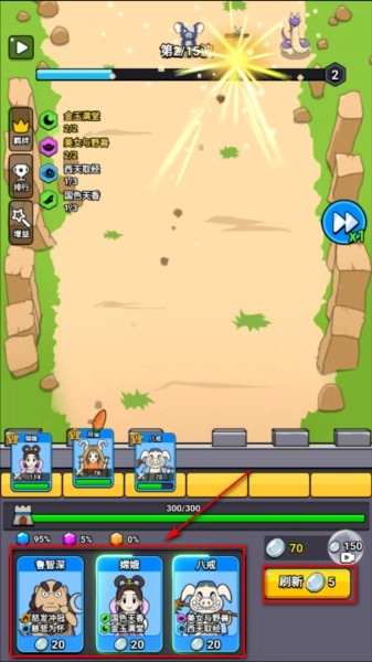 5、点击【刷新】按钮可不断刷新角色列表,从中挑选所需角色安排上阵;若再次选择已有的相同角色,该角色将进行升级,其等级上限为5级(满级)。