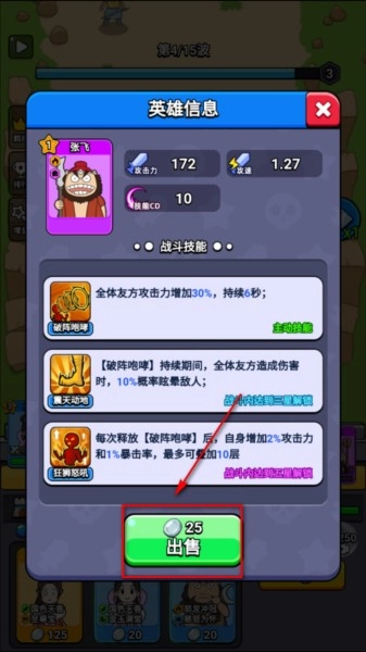 6、点击上阵的角色可以查看信息,也可以出售来空处卡槽换其他的角色。
