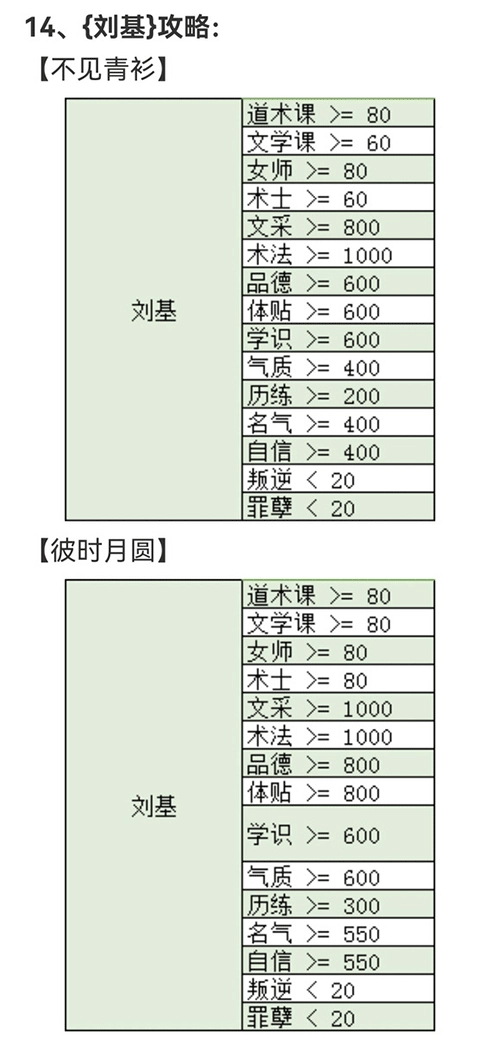 好感度≥110,评书≥80,书画课≥60,文学课≥60,琴艺课≥60,感受≥600,武勇≥500,文采≥500,臂力≥500,气质≥700,智力≥500,亲和≥600,体贴≥500,技艺≥700,依赖≥300,自信≥500,名气≥500