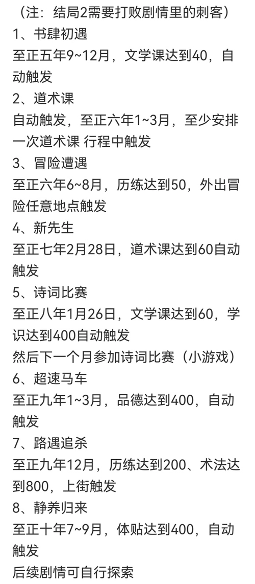 3、对联赢奖品至正六年9月10日好感度>=20 文学课>=20 4、茶馆展才艺至正七年2月11日好感度>=30 琴艺课>=40