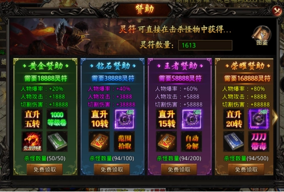 3、杀任意怪物达到条件,领取白嫖赞助,获得对应等级直升券