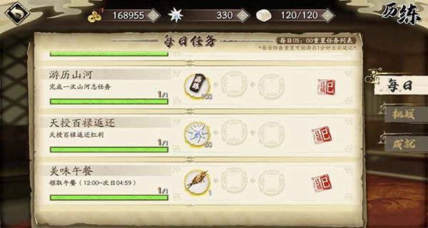 剩下的就是在游戏后期,体力的主要来源,分为两种,一是日常任务中,也就是游戏的历练中每天能够在过了特定的时间后领到三次烤鱼,这些烤鱼每个可以恢复五十点体力。