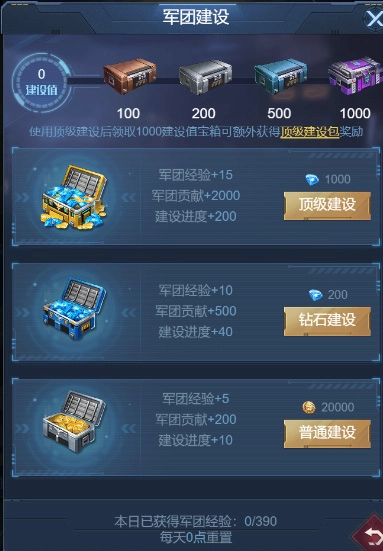 可以进行三个档次的建设,为军团提供军团经验,提升军团等级,开启更多功能与玩法。
