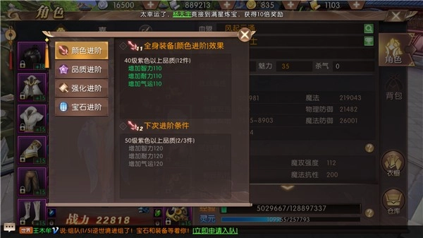 要是问我什么装备值得选,那答案一定是紫装。紫装比蓝装多一条属性,而且身上凑齐5件紫装时,就能完成“传奇之路”第四章的任务。除此之外,拥有1件、6件、12件紫装还能分别解锁“紫气东来”“衣紫腰金”“姹紫嫣红”这三个成就,集齐12件紫装更能获得同名的紫色称号。最关键的是,12件紫装会触发颜色进阶效果——比如12件40级以上的紫装,能为角色增加110点智力、110点耐力和110点气运,这些属性恰好是药师职业所必需的。