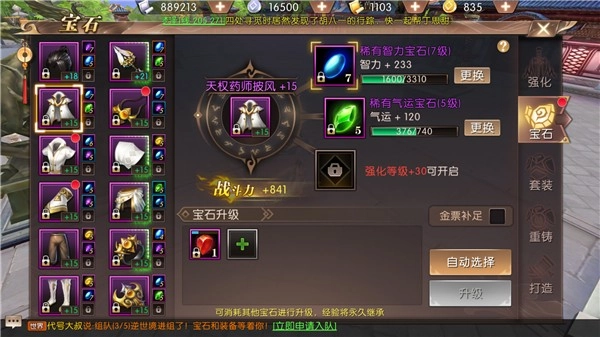 宝石选择方面,主要推荐耐力、智力和气运属性的宝石。不少玩家问是否需要精神宝石,我的建议是不推荐——毕竟药师的加血技能CD比较长,实际耗蓝量并不算多,再加上系统支持自动吃药,蓝量对药师来说没那么关键。不过前期宝石稀缺时,如果有紫色或橙色的精神宝石,也可以先装上提升战力,后期再替换下来。另外补充一点:吞宝石时最好参考宝石进阶规则来操作,这样能额外增加更多属性加成。