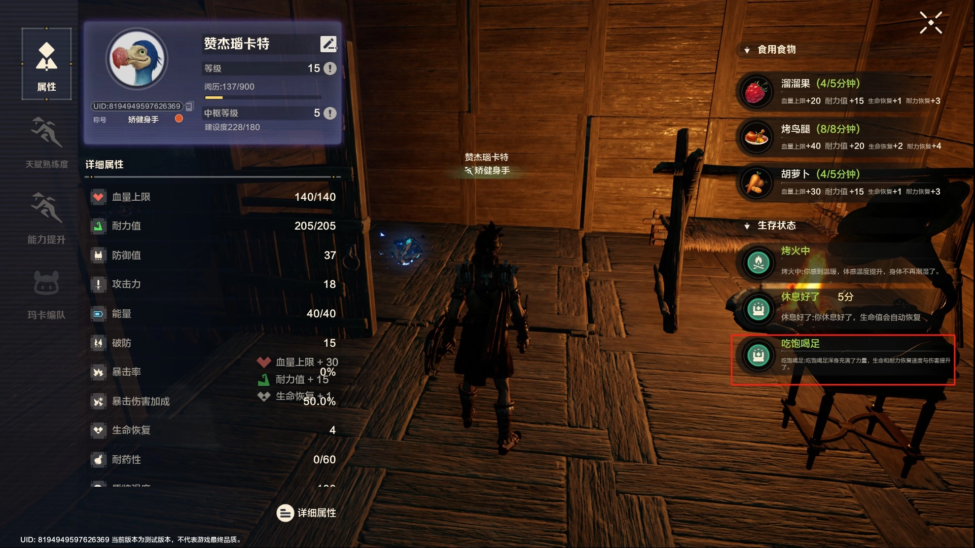 寒冷和潮湿状态则需要到篝火附近点燃篝火消除。下雨时,篝火需要在屋顶下方才能点燃。