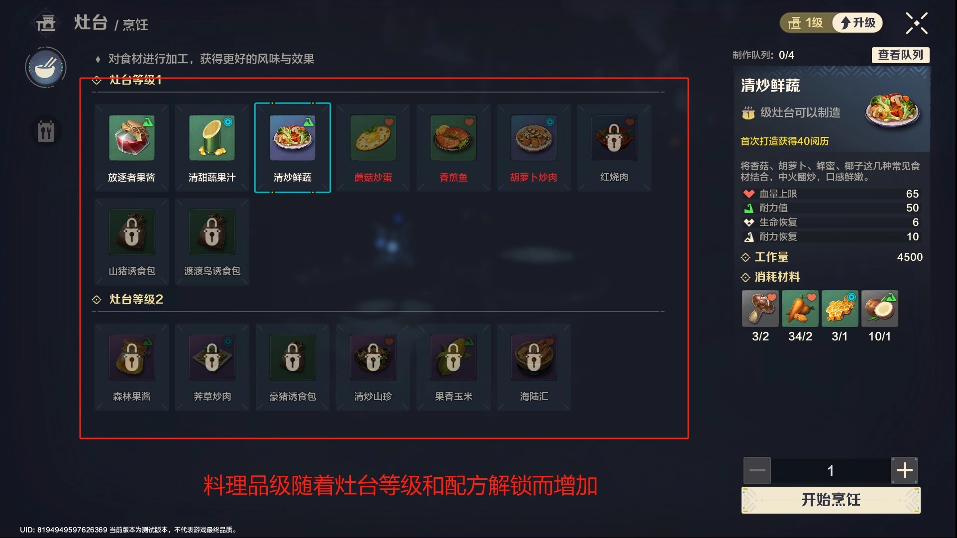 当角色使用三种不同食材后,将获得“吃饱喝足”的增益状态,此时生命与耐力恢复速度以及伤害都会有所提升。而食用经过烹饪的料理,能够让进食带来的增益状态维持更久,并且不同品级的料理,其增益效果的持续时长也各不相同。
