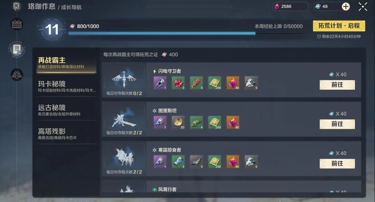 在珞珈作息里,【成长导航】同样是快速积累阅历的实用途径。它包含再战霸主、玛卡秘境、远古秘境和高塔残影四种玩法,每种玩法都需要消耗体力,而消耗体力后能获取相应奖励,其中就包含了丰富的阅历。