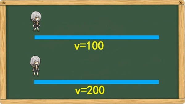 简单来说,星穹铁道里的每个角色都要在一圈长度为S=10000的赛道上赛跑,角色跑完一圈就会进行一次【行动】。按照S=vt这个公式,速度v越快的角色,就能越早完成一圈并触发【行动】。比如速度200的角色A,跑完一圈的时间是速度100的角色B的一半,所以在B完成一次行动的时间里,A能完成两次行动,具体可以参考下图: