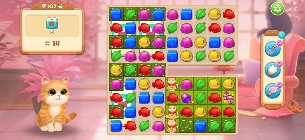猫友们在通关时可以看到关卡内有些图块上带有小硬币的标志,只要消灭这些图块就可以获得硬币,为猫咪们装饰【暖阳春游】房间。