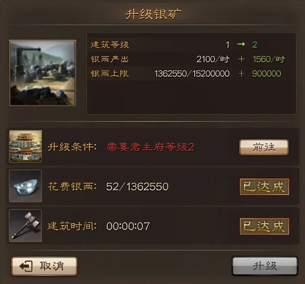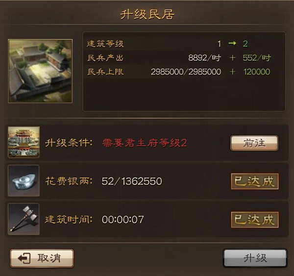 为什么要把银矿和民居放在一块儿讨论呢?因为这两种建筑的功能其实挺相似的——银矿负责产出银子,民居则能产出民兵,它们的产出都很稳定。不管你是喜欢专注种田发展的玩法,还是偏爱掠夺他人的侵略性玩法,银矿和民居都得尽量升满才行。要是你想追求收益最大化,就得尽可能让矿稿和征兵令的增益状态一直保持着,毕竟这两样东西能直接提高银矿和民居的基础产量,而且关键是它们价格便宜,参加活动也能获取到!