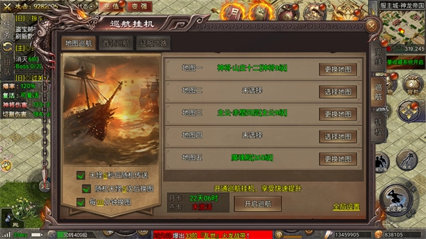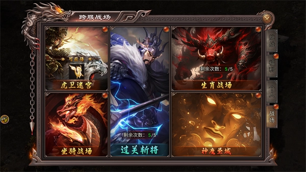 点击界面右上方的战场图标,就能展开涵盖六大功能的跨服战场界面,具体包括虎卫迷宫、坐骑战场、过关斩将、生肖战场和神魔圣域,参与这些挑战可获取战场道具,助力提升自身战力。