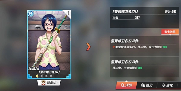 战意卡是左右人物属性值与战力高低的又一因素,选择一套适合的战意卡可以非常有效地提升角色在关卡战斗时的表现。就路飞而言,前期最适合的战意卡卡组莫过于“力系”角色专属的“誓死捍卫名刀”。