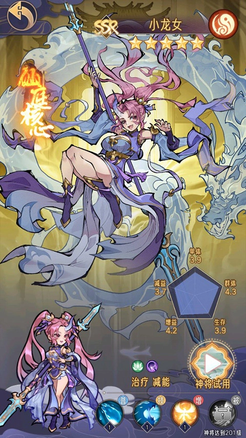 (4)小龙女:小龙女的普通攻击能够积累能量,搭配闻仲大招的恢复效果,可显著提升自身大招的释放频次,做到每2回合就能释放一次全体治疗技能,同时为后排附加减伤护盾,让队伍的治疗能力得到充分保障。
