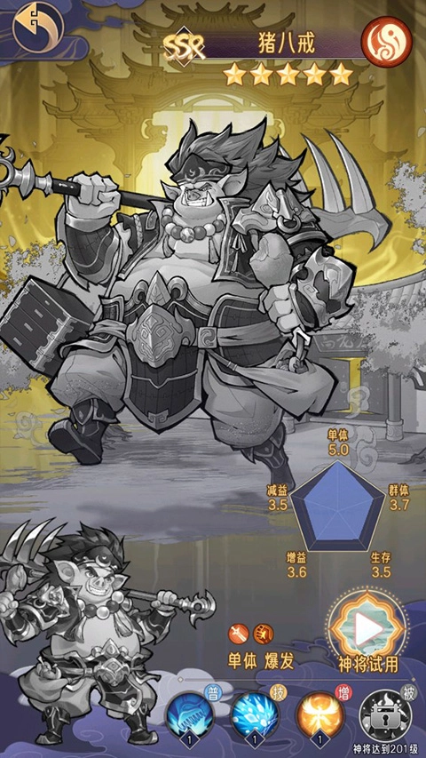 (5)猪八戒:二师兄在队伍中是充当收割的角色,出色的单体伤害,可以让敌方后排第一回合直接斩杀。