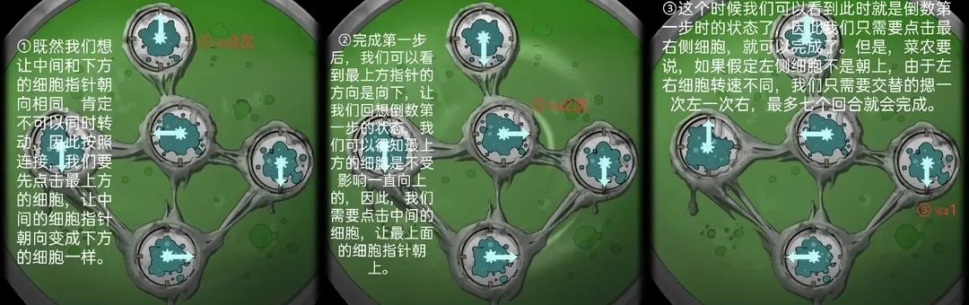 诊断室显微镜的解谜思路可以这样拆解:每个细胞之间的连线意味着,转动其中一个细胞的指针时,所有与之相连的细胞指针也会同步转动——这种直接可视化的设计显然降低了解谜难度。要让所有箭头都朝上,首先得搞清楚不同细胞的指针转速差异:普通的左上中下四个方向的细胞,转一圈需要点击四次;而右侧的细胞比较特殊,转一圈只需要点击两次。这就意味着,解谜的最后一步必然要操作右侧细胞。基于这个结论,我们可以从“所有箭头朝上”的最终状态反向推导一步,就能得到如图所示的指针指向。