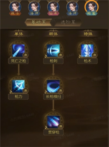 近战物理输入职业!仅有一种进阶分支!拥有多种控制类技艺!还可以追杀打乱敌方节拍!同时!枪客拥有全职业中最多物防加成形态!而且可以给一切人物增长物理防守!