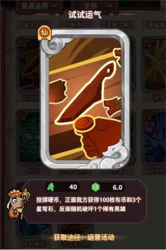 试试运气:投掷硬币,正面我方获得100枚布币和3个星穹石,反面随机破坏1个稀有英雄。