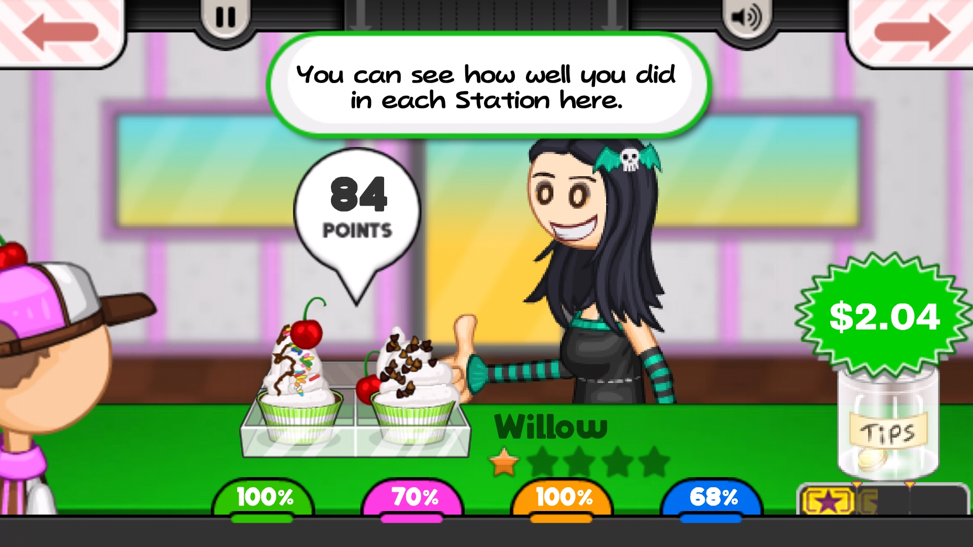 制作完成后将冰淇淋递交给客户,我们得到了84分的评价以及2.04美元的收入。
