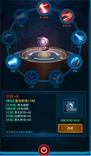 1、雷达商城亲密度LV.10可刷新出的巨眼,主技能激光散射,副技能散射起火,主属性从激光秒伤、激光制空防御中随机,散射起火的效果是在触发激光散射之后,被散射的战舰100%会“起火”。