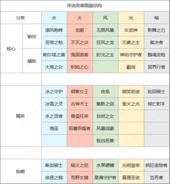 2、忽略史诗(紫色)英雄,我们可以根据技能强度和获取难度对传说英雄进行分类,下面是总表: