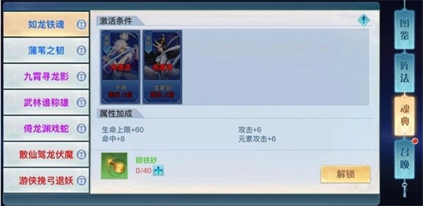 在图鉴界面中,玩家们能看到目前所收集的所有兵魂伙伴,点击卡片即可进入兵魂的养成界面,在这里可以消耗碎片对兵魂人物进行激活、升星,消耗陨铁砂可对兵魂伙伴进行升阶。