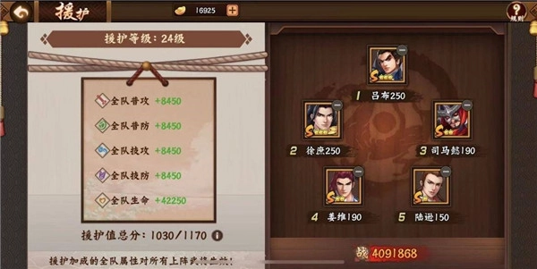 一套优质的援护阵容同样能为我们带来相当可观的属性加成,每提升一级至少可获得数千乃至一万左右的战力加成,加成数值会随援护等级的提升逐步增加。对于“平民玩家”,建议以A级武将作为援护主力,通过消耗金币的普通招募方式获取升星卡,性价比极高,不过援护等级上限最多为24级。而“土豪玩家”则建议直接选用全部S级武将进行援护,由于S级武将的援护点上限更高,即便升星等级相同,S级武将也比A级武将高出不少。