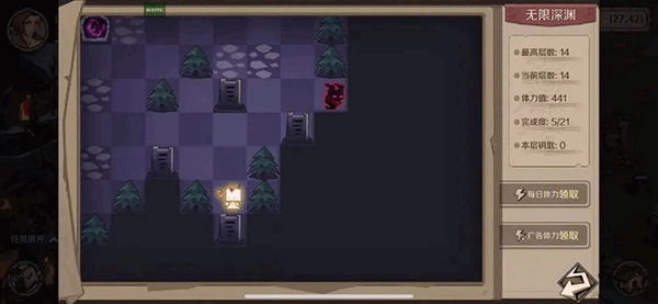 深渊挑战副本的机制类似迷宫,玩家通过击败格子中的野怪,可获取经验、材料与宝石碎片。参与该副本挑战需消耗体力值,体力值每日会自动恢复,此外还能通过每日体力领取和观看广告的方式获取免费体力(目前观看广告得体力的功能暂未开放)。在游戏前期,深渊挑战是玩家不容错过的重要玩法,不仅能收获大量经验、提升技能等级所需的阅历、铜币,以及增强战斗力的宝石碎片,还能通过每日奖励领取到一定数量的材料。