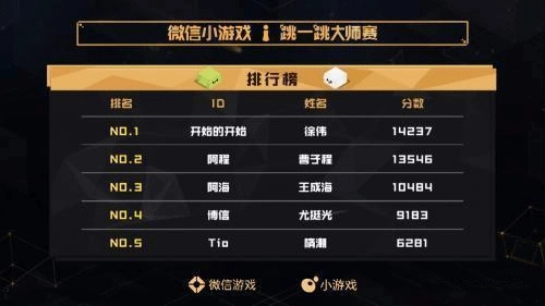 2018年,广州举办了跳一跳大师赛,全国30位该游戏的顶尖玩家在此集结。徐伟以14237分的优异成绩摘得桂冠,同时他也是“跳一跳”当前54594分最高纪录的保持者,还在本次赛事中赢得了10万元的冠军奖金。快来加入游戏吧,说不定下一位跳一跳高手就是你!
