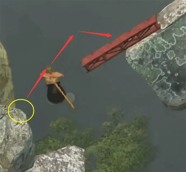 7、山壁夹缝这一关还算容易,关键是要把头上那两个灯具稳稳勾住,所以得选好起点位置和角度,之后让锤子顺着这个轨迹勾过去就可以了。