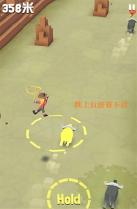1、进入游戏后,角色会骑着小野牛,按住画面不松手,当前方动物距离较近时,滑动屏幕进行跳跃。