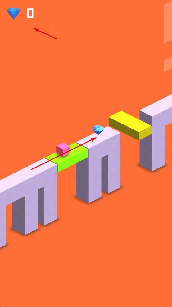 1、操控粉色方块在赛道上移动,通过特定操作使方块在不同颜色的平台上移动,跨越障碍物。