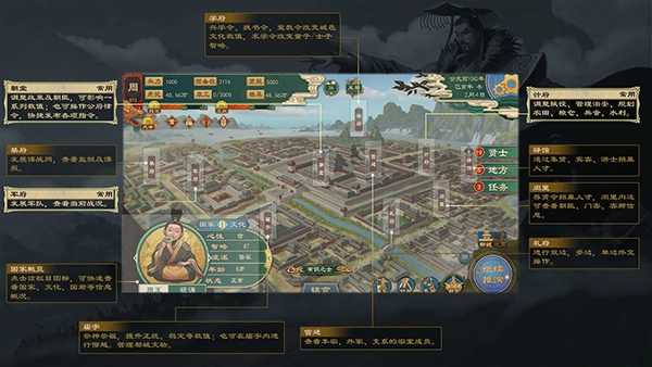 【都城】界面主要用于处理大部分国家内政事务以及各类人物的管理工作。与朝堂功夫律令板块中的批量操作不同,通过该界面进入的各项功能能够针对单个个体进行具体的配置与调整,在显示和操作层面会更为精细。