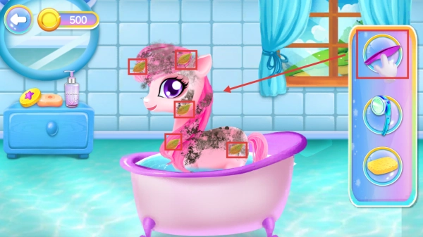 2、道具辅助护理:可以运用形形色色的道具,凭借这些道具踏入奇妙的护理天地,给小马公主完成护理工作,使后续的装扮呈现出更优的效果。