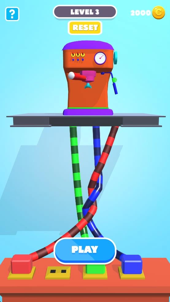 1、进入游戏首界面,可见标有PLAY的蓝色按钮 ,点击它开启关卡,需留意红蓝两根缠绕线缆,提前观察布局。