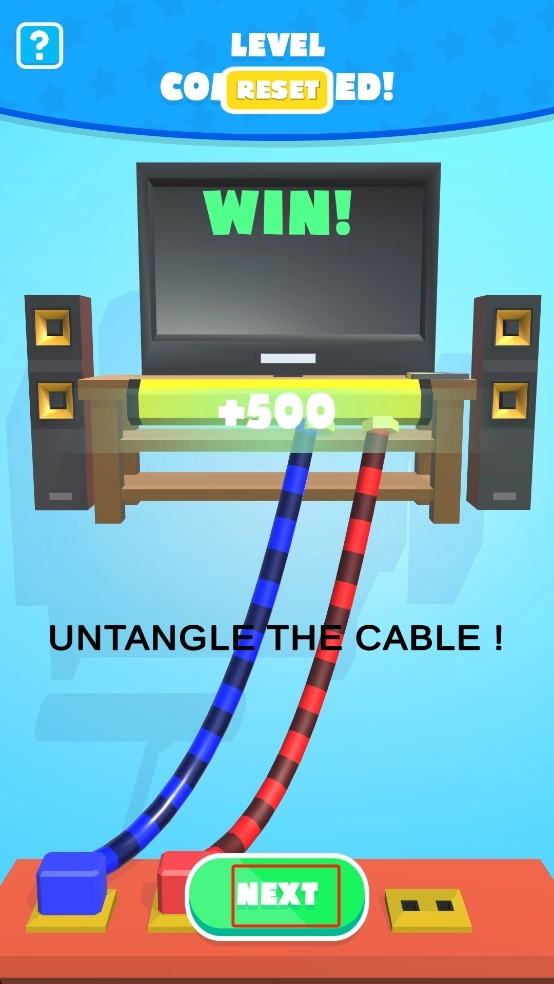 3、成功理顺线缆后,屏幕显示WIN及+500奖励 ,点击绿色NEXT按钮,借此进入下一关,继续挑战更复杂线缆缠绕场景。