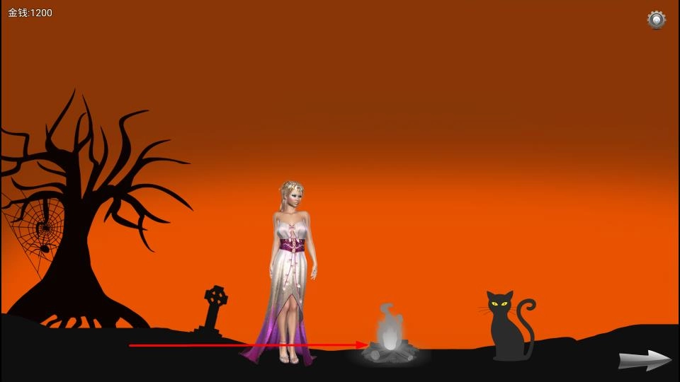 2、操控角色如穿长裙的女性角色移动,靠近篝火、墓碑等场景元素依红色箭头指引方向,探索地图、收集资源如金钱从1200变为1300。
