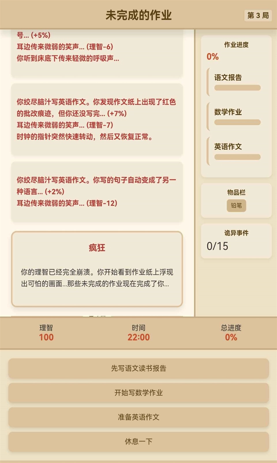 2、每次行动需从语文、数学、英语作业或休息中抉择,平衡科目进度与理智值。