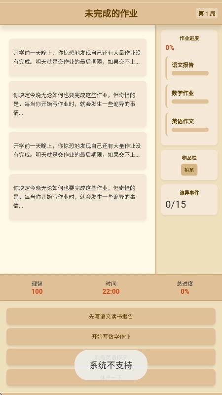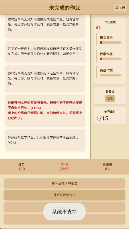 4、玩家需要权衡做作业和休息的时机,合理分配时间来应对随机事件。比如,当理智值较低时选择休息,防止触发高风险事件。