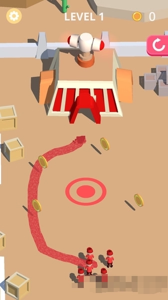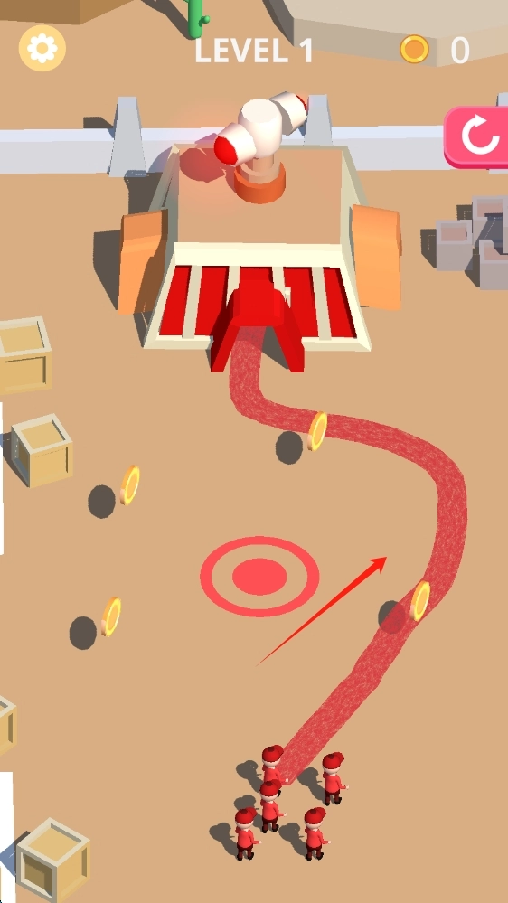 1、在LEVEL-1场景,引导角色沿红色路径移动,收集金币,避开障碍,顺利到达终点,点击划线。