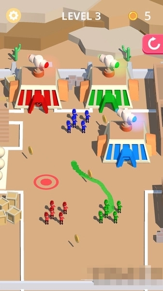 3、LEVEL-3场景,观察不同颜色区域,规划角色移动路径,收集金币,完成关卡目标,点击重开。