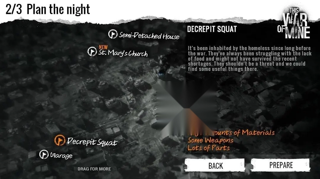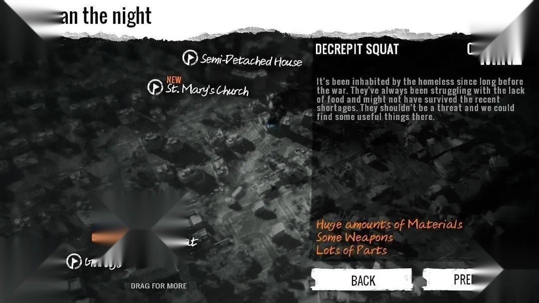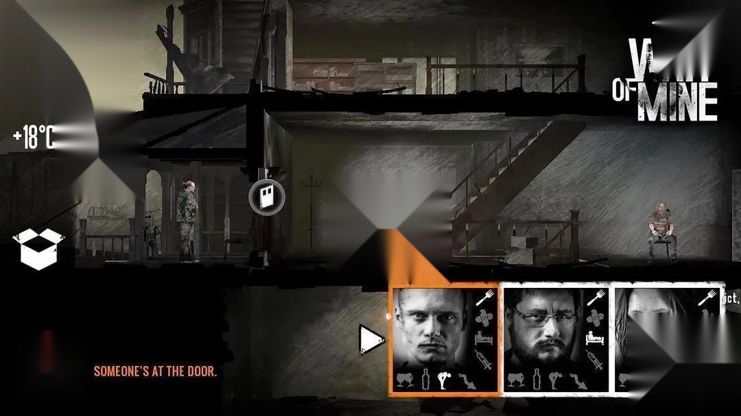 住着饥饿的画家,去的时候给他带个生肉就能够他活到战争结束,然后他会带你去地下室获得两个钻石和一瓶酒精,并且全家满足。一个锁,一个栅栏,大量材料,无食物,有电子元件与零件。