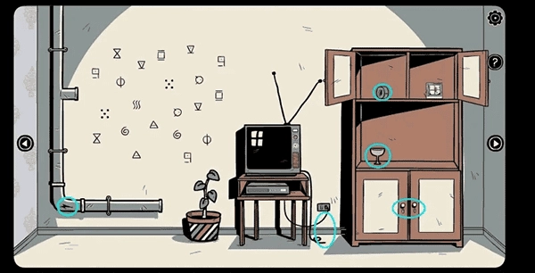 3、接下来继续向左走,取走架子上的「笔记本」以及花盆里的「石头」,随后查看上方的提示,并把得到的纸条放置于此处。依据笔记本上的提示打开下方的柜子(留意符号顺序可能会有变动),从而获取「镜子」。
