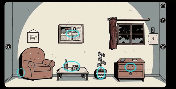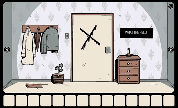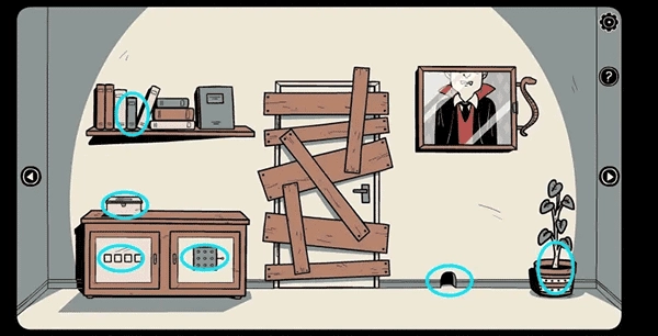 9、走到门口,用钥匙打开抽屉并取出里面的「手套」;随后用玻璃碎片划开右侧墙上的壁纸,再依据后续提示打开被木板封住的门左侧的柜子,从中获取「钥匙」与「开关」。